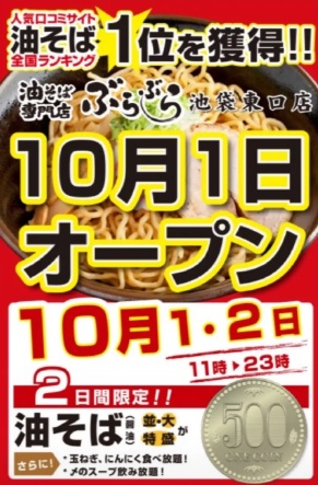 横浜で人気の油そば専門店「ぶらぶら」が池袋駅東口に10月1日グランドオープンします。