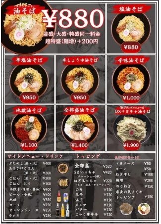 10月1日、2日はオープニングキャンペーンとして、看板メニューの「油そば(醤油)」を、特盛(300g)まで一律500円(税込)で提供してくれます。