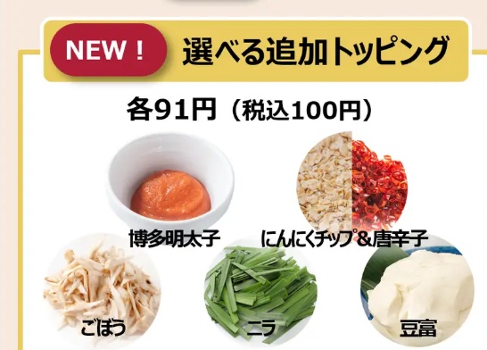 さらに、博多明太子、にんにくチップ&唐辛子、ごぼう、ニラ、豆腐が税込100円で追加でトッピングできます。