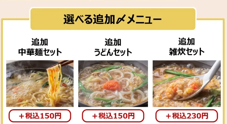 また追加メニューも、追加中華麺セット、追加うどんセット、追加雑炊セットと3パターンから選択できます。