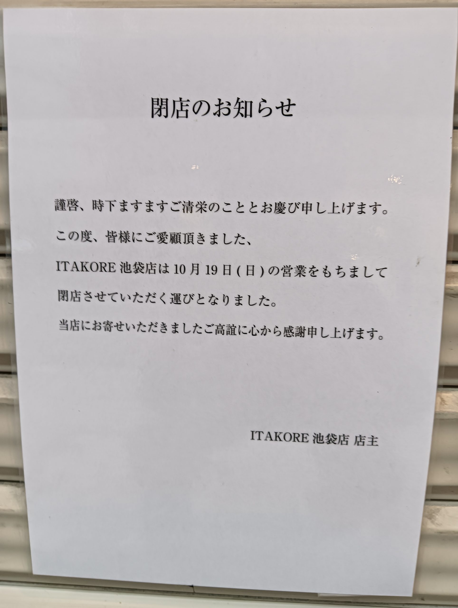 先日池袋西口の情熱ホルモンにホルモンもつ鍋を食べに行くと、隣のレストラン&居酒屋のITAKORE(イタコリ)が閉まっているのに気づきました。