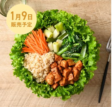 1月9日から販売予定のうま辛味噌チキンと焼きネギのサラダ。