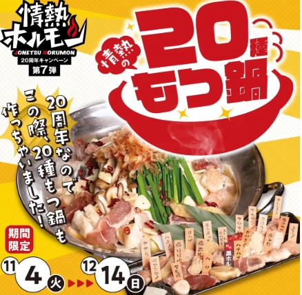 1.情熱ホルモンが創業20周年記念で「情熱の20種もつ鍋」を販売
