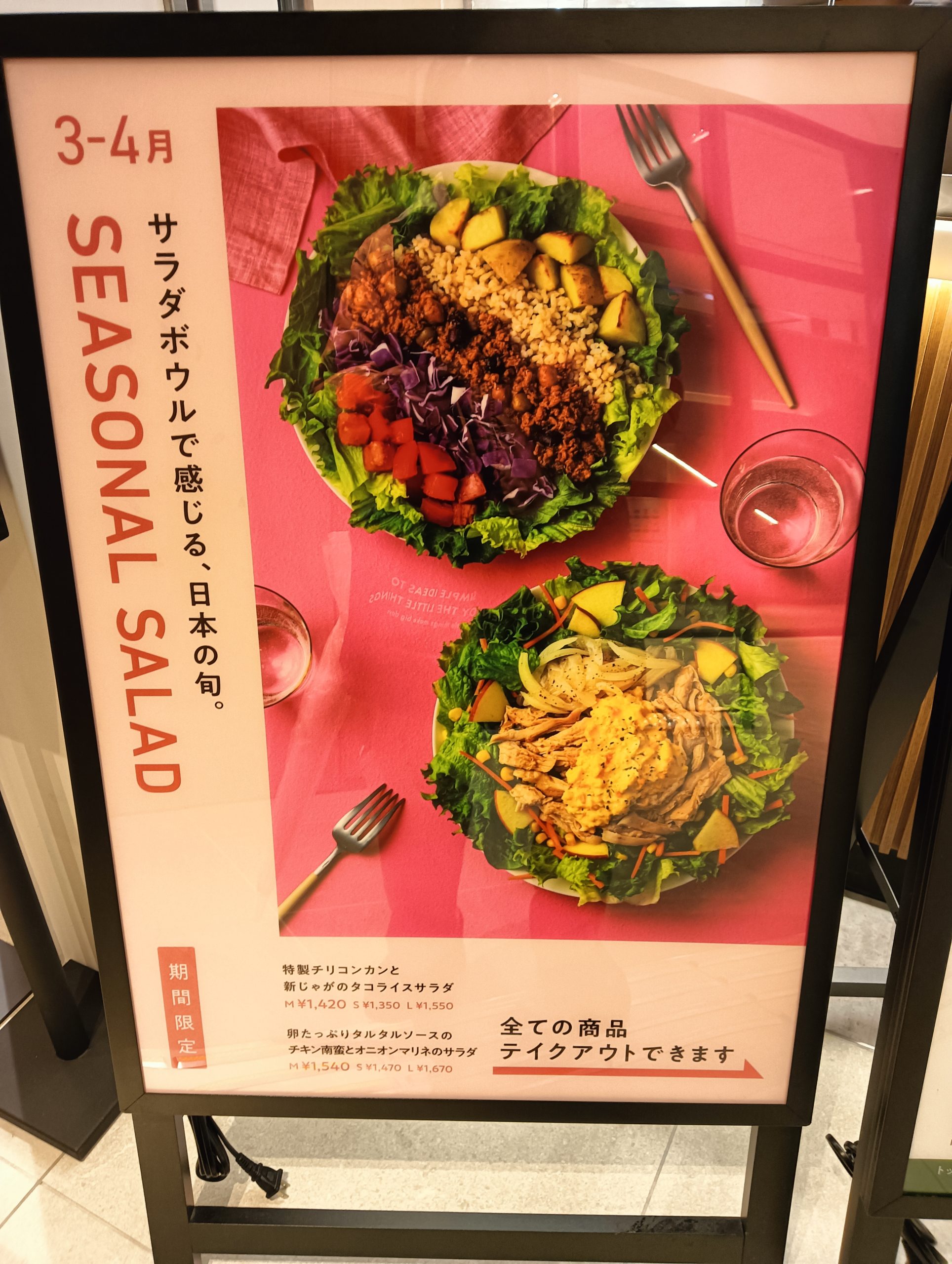 3月‐4月のSeasonal Saladaは、「特製チリコンカンと新じゃがのタコライスサラダ」と「卵たっぷりタルタルソースのチキン南蛮とオニオンマリネのサラダ」の2種。