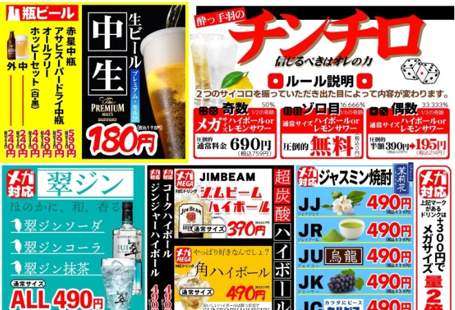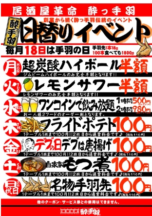 ハイボールやレモンサワーの半額割引、飲み放題1時間500円、手羽先や唐揚げの100円特売などを日替りで実施する「日替りイベント」は毎日開催されています。