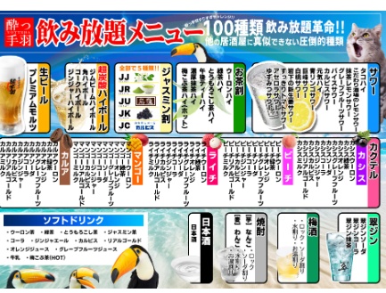飲み放題メニューは、飲み放題革命として、100種類のドリンクが1時間 980円、2時間 1,580円で心ゆくまで飲み干せます。